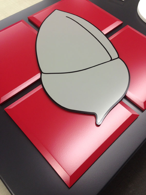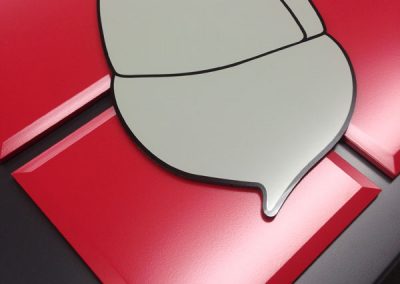 Our workshops fabricated all the elements . These were then passed to our paint shop to be wet sprayed in a satin finish for durability. Finally, these were fitted with a profile cut vinyl highlight detail for the acorn shape.