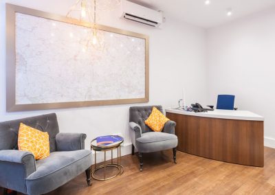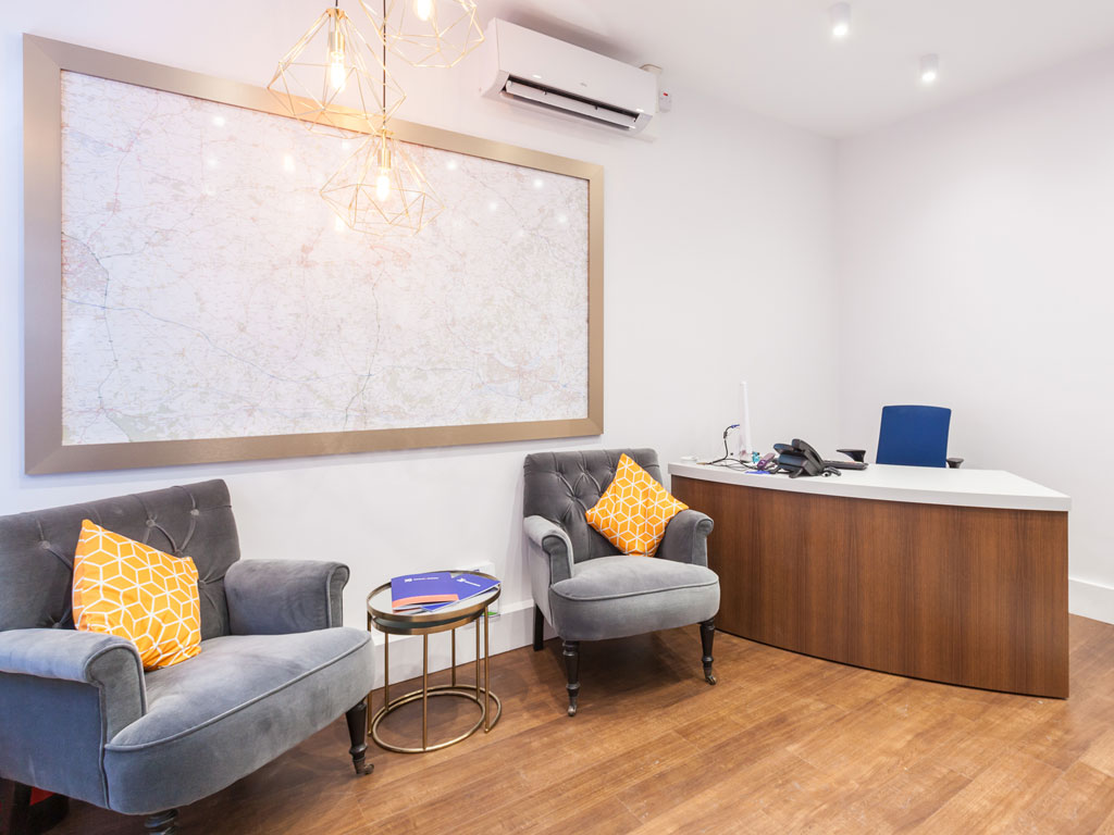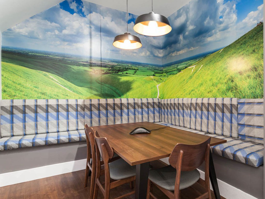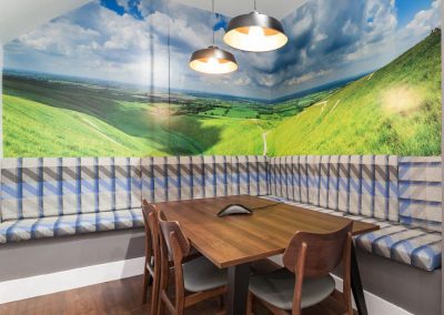 We also supplied wall applied vinyl prints, front fascia logos and the curved bespoke laminated desks.