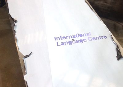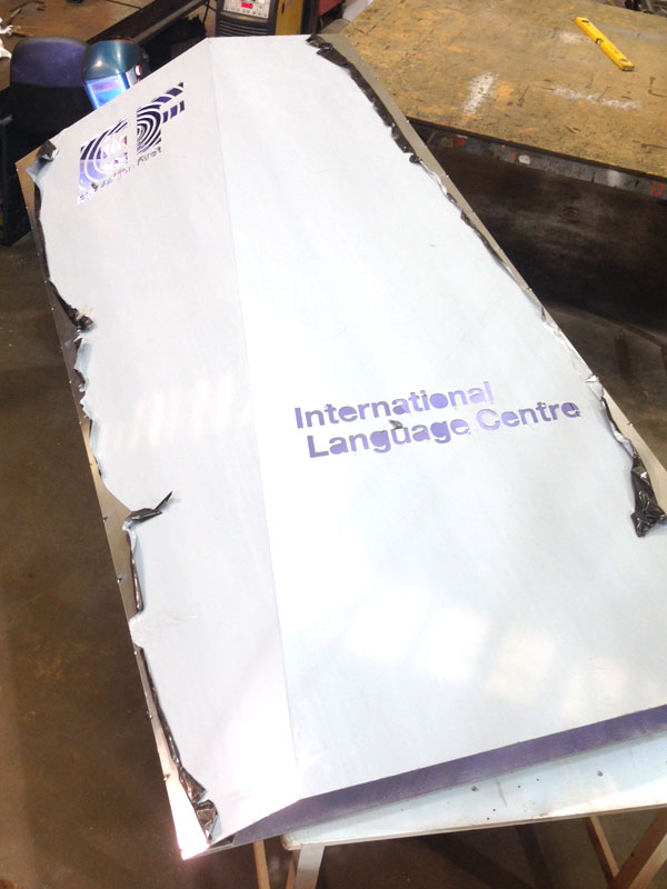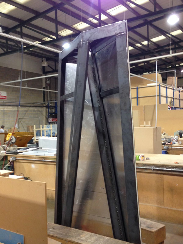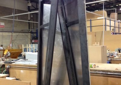 Care had to be taken when welding the two halves together to prevent any distortion. Then we carefully painted the whole unit as one. Access into the structure to inlay the opal text and mount the LED’s was very tight, but collectively we managed to resolve the issues and produce an impressive and extraordinary monolith complete with illuminated logos.