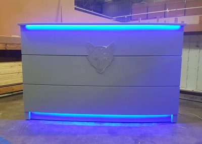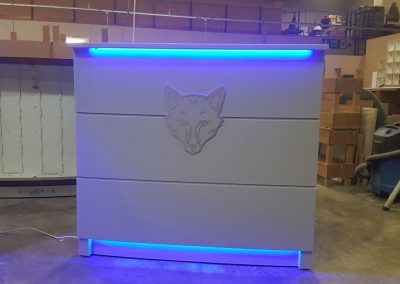The front logos were router cut Corian with brushed stainless steel highlights inlayed into the face. We also used blue LED’s to provide a halo glow around the kicker and the underside of the work top.